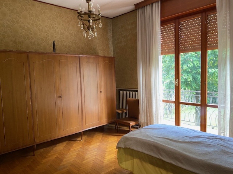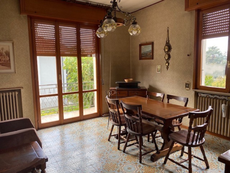 Casa unifamigliare immersa in un ampio giardino. Risulta composta da un luminoso soggiorno con balcone, tinello e cucinotto, tre camere da letto di cui due matrimoniali e due bagni. L'autorimessa è spaziosissima in quanto in passato era adibita ad officina: possibilità quindi di ricavare un altro appartamento a piano terra. E' circondata da un parco spazioso e ombreggiato da alberi secolari. |